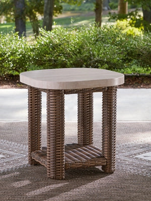 Get back to nature with the relaxed styling of the Angel Island outdoor end table. Crafted with a sturdy aluminum frame and resin wicker, it offers exceptional durability and style. A smooth tabletop with softly rounded edges holds nibbles, sips and more. And don't forget the handy lower shelf. Sounds like fabulous form and function to us.