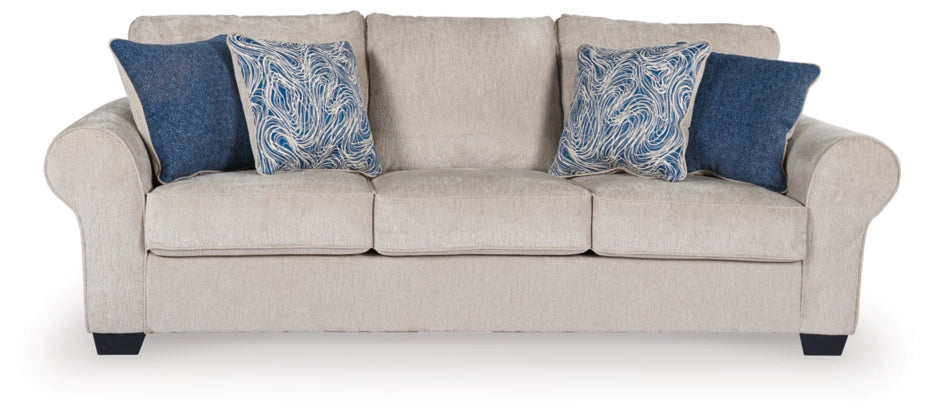 This sumptuously comfortable sofa makes it easy to camp out in style. Inspired by quality menswear, the linen-weave upholstery naturally works in a rich jute tone. Crisply tailored box cushions and roll arms give the sofa a modern classic shape sure to complement so many aesthetics. Sporting shades of ivory and indigo blue, four decorative pillows add fashionable flair.