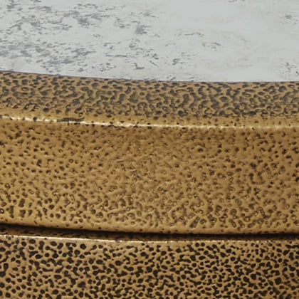This end table blends a traditional feel with contemporary design cues. Antiqued gold texturing on the frame has the look of timeworn, hand-forged metal. A tempered glass top with a faux marble finish provides a refined contrast. Chic when hosting decor, a lamp or holding entertainment essentials, this table rounds out your living room with transitional flair.