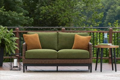 The Horizon Hall outdoor loveseat recalls the aesthetics of nature to bring an inviting, high-style feel to your patio or lanai. Its Nuvella+™ performance fabric is made with enhanced UV resistance, so the chic green hue stays brighter for longer. Worried about the weather? Don't sweat it—the durable resin wicker withstands the elements from season to season.