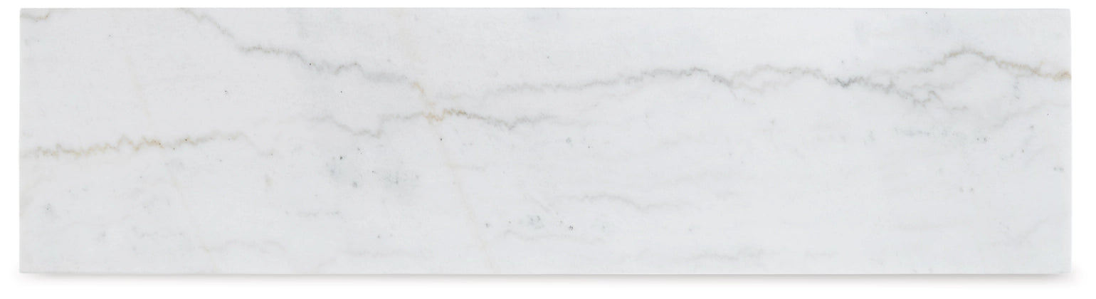 This sofa table is simple in design but big on style. Finished with a trend-right grayish brown wood tone, its bold, blocky profile and natural marble top are timeless classic choices that is ideal for pairing with an ottoman underneath to pull extra seating into the room or remaining clean and sleek on its own. Adding to its beauty, the marble top's color variations, fissures, mineral deposits and veining are naturally formed and are not defects.