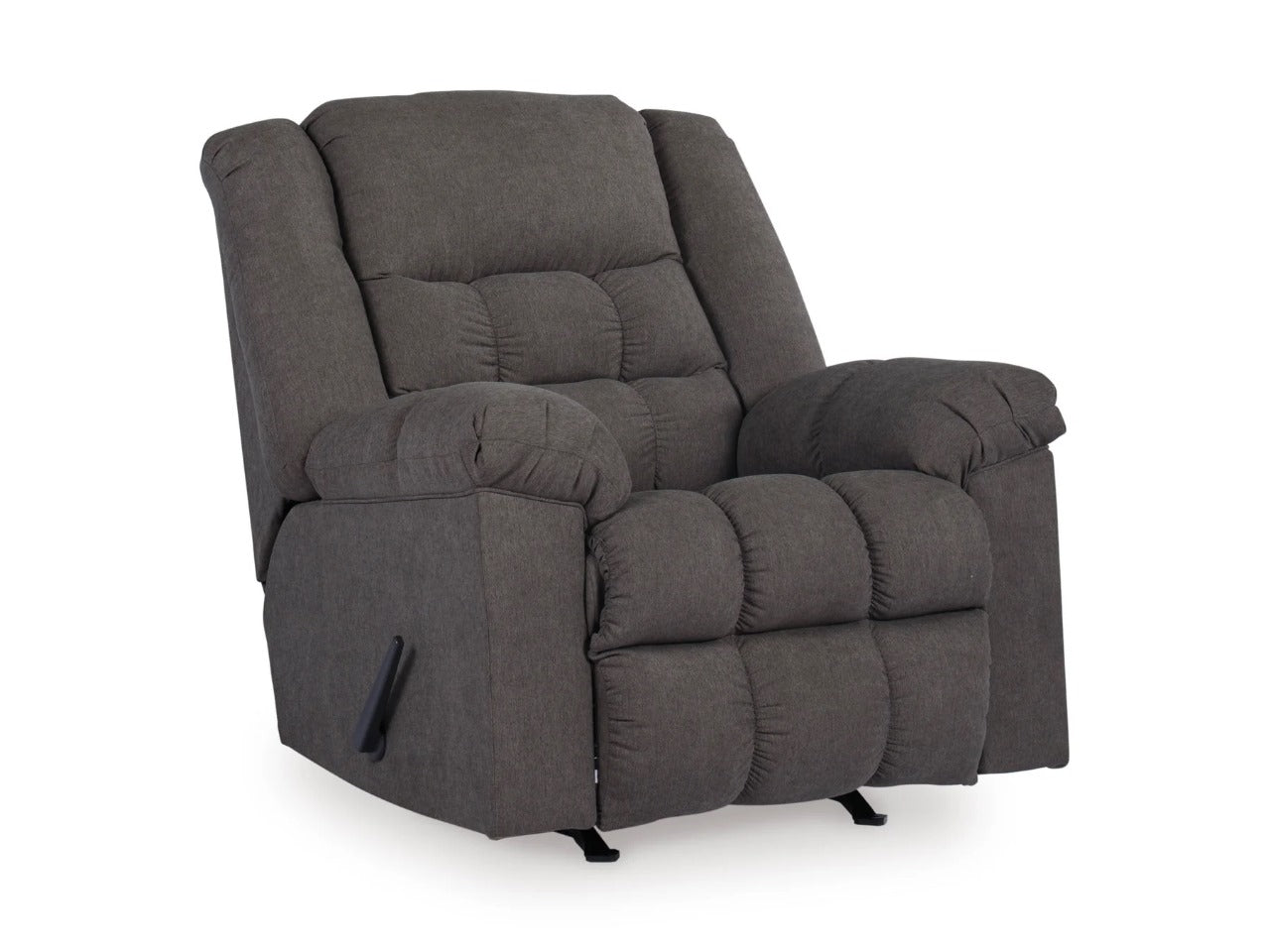 Sink into comfort with the Kegler Charcoal Rocker Recliner, where plush support meets everyday functionality. Upholstered in a soft yet durable charcoal-gray fabric, this recliner features a gentle rocking motion and an easy-to-use pull-tab reclining mechanism—perfect for relaxation after a long day. Generously padded arms, a divided back, and high-resiliency cushioning provide lasting comfort in a sleek, contemporary design.