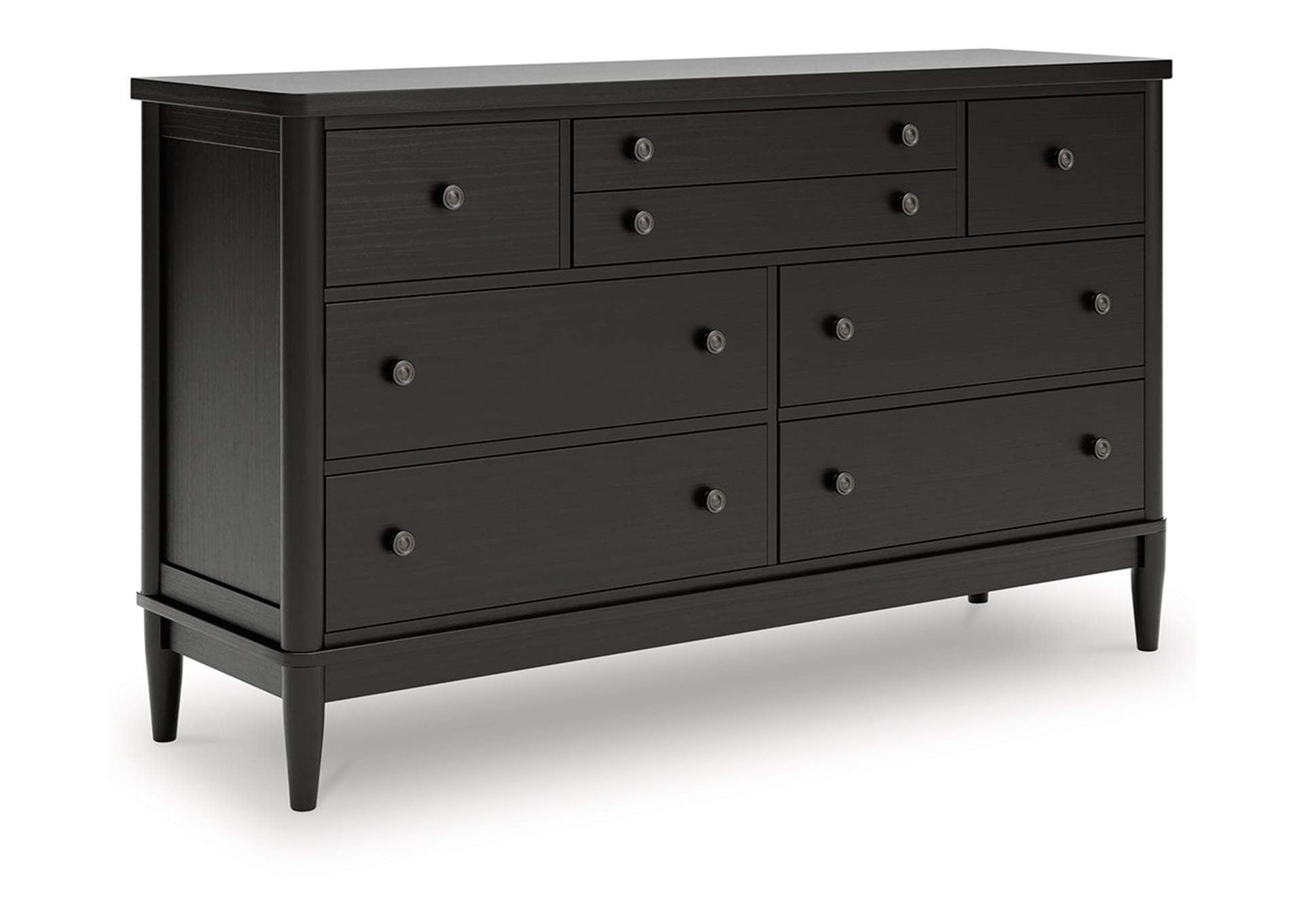 Farmhouse and contemporary design, balanced beautifully. The Portdown dresser and mirror merge a clean-lined silhouette and round posts for an updated sensibility. Simple inset drawer fronts and a mix of drawer sizes stack up to on-trend form and function. A modern French black finish with deep warm brown undertones perfectly punctuates this casually inviting duo.