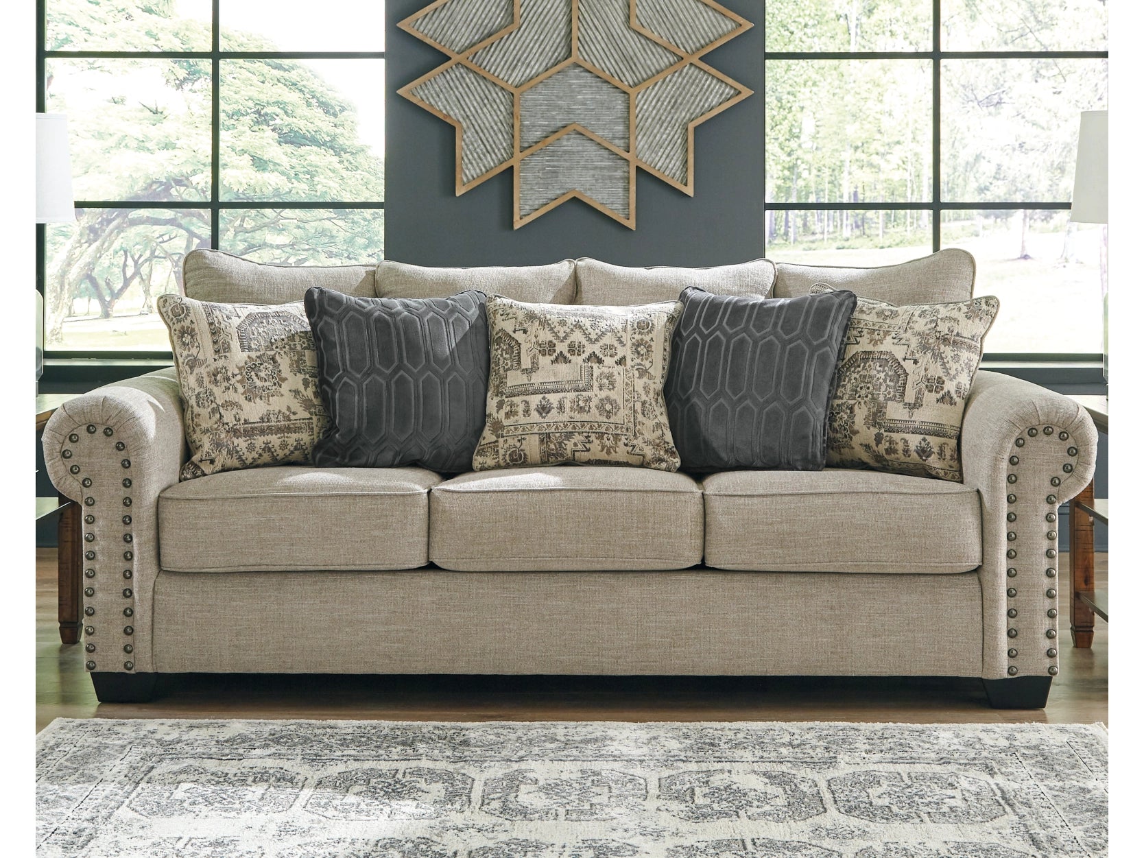 The Zarina sofa lets you make a high-style statement at a comfortably affordable price. Richly traditional roll arms are given a modern punch care of oversized nailhead trim in a black nickel-tone finish. Linen-weave upholstery in fresh and clean sandstone beige is complemented with designer pillows that add texture and sophistication.